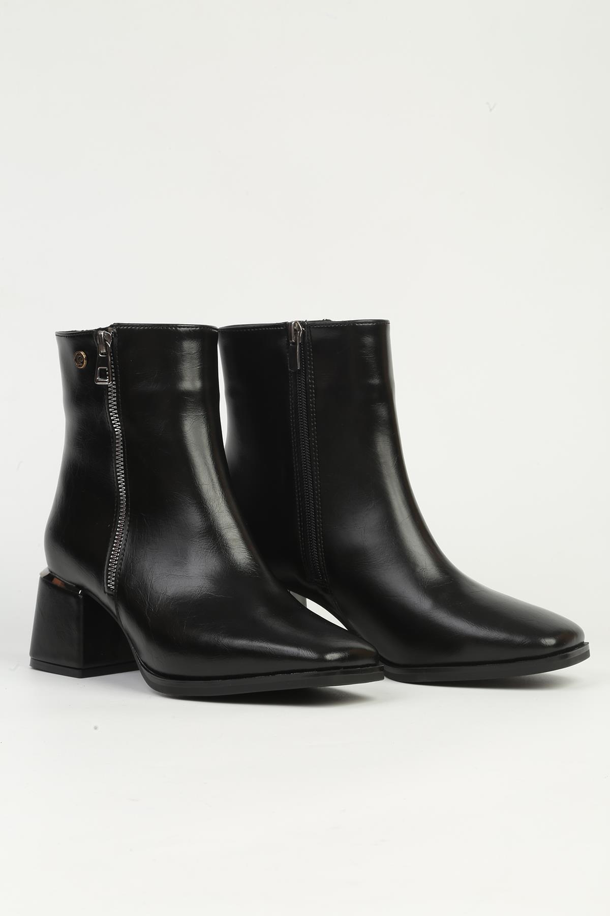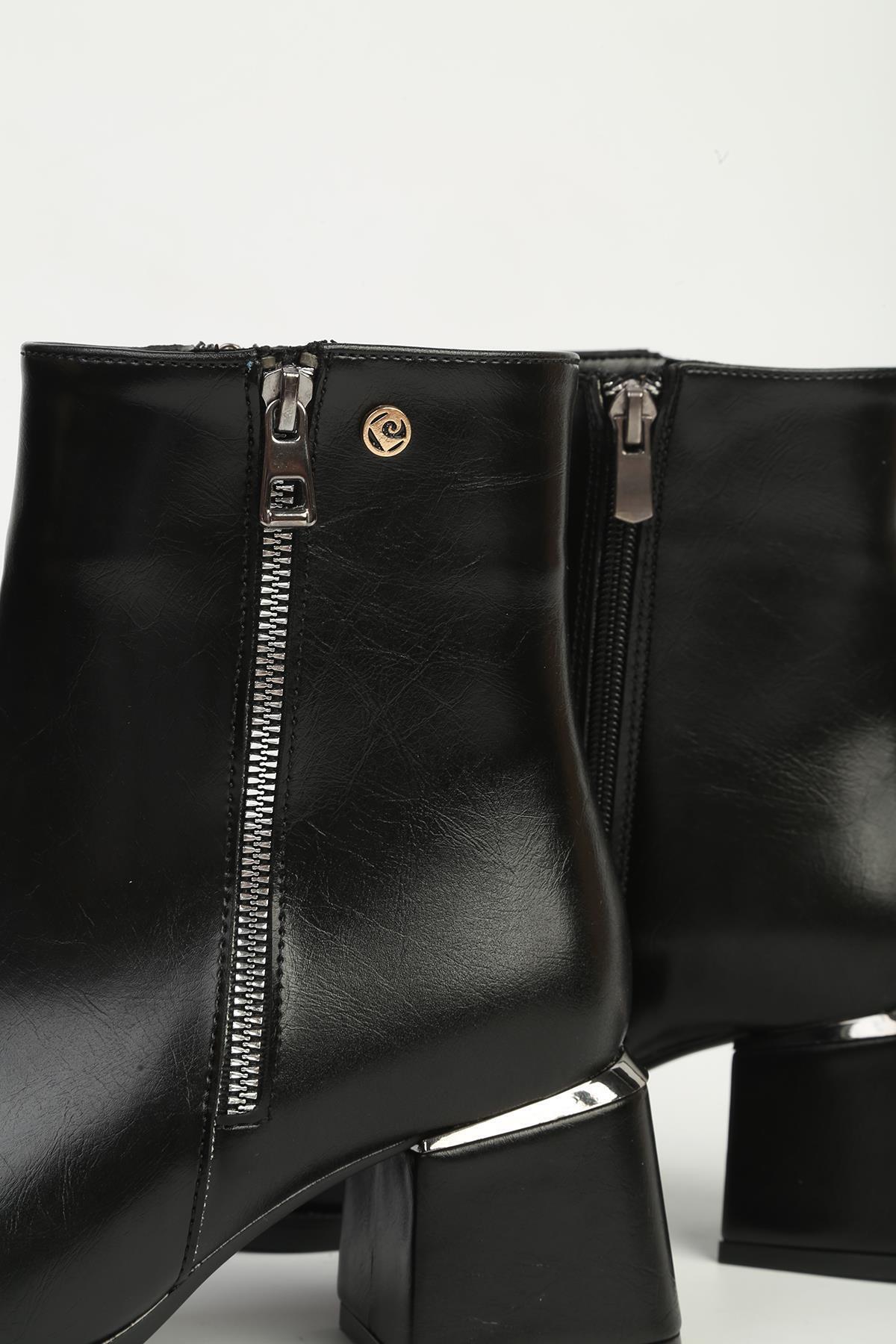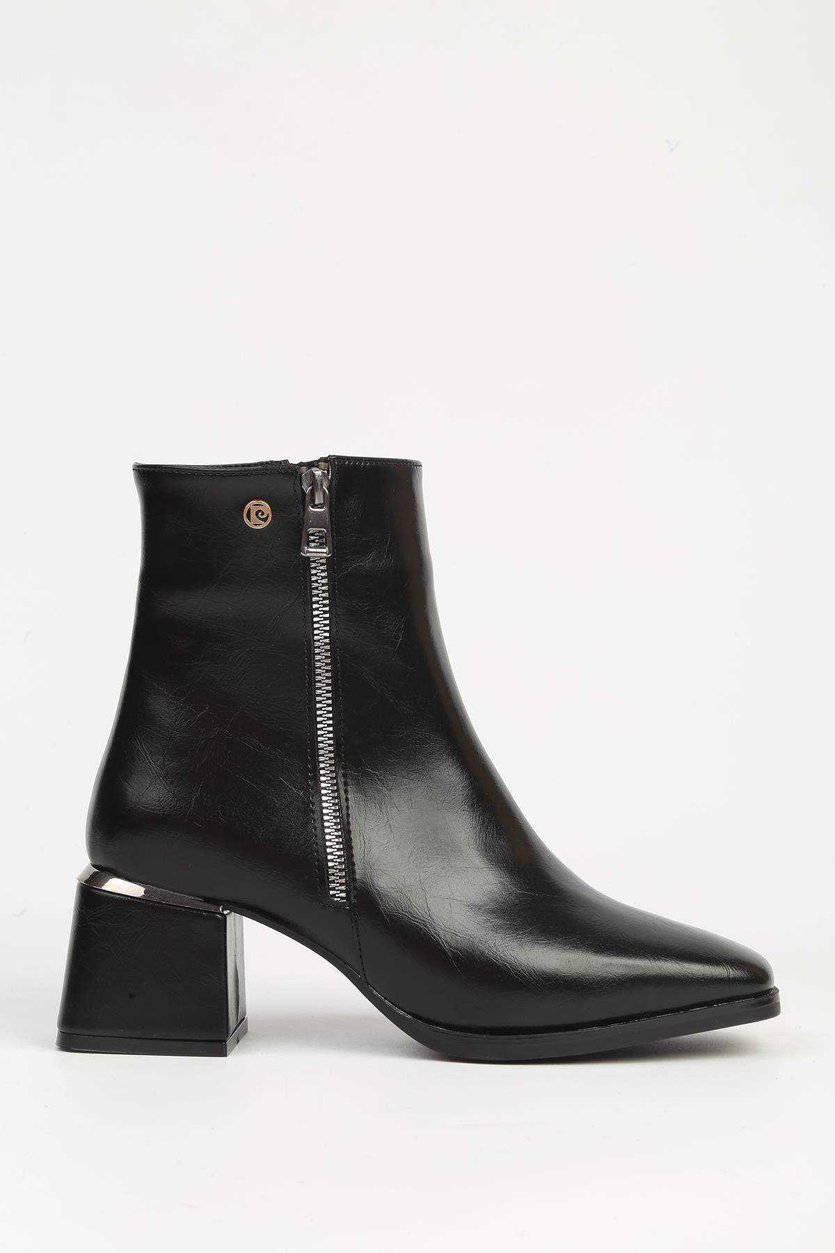 Dış Materyal : Suni Deri; İç Materyal : Tekstil; Taban Yüksekliği : 5 cm; Taban Materyal : Termo; Günlük Kullanıma uygundur.; Kutu içerisinde bulunan kullanma talimatlarına uygun şekilde temizlenmesini öneririz.; Makinada yıkanmasını ASLA önermiyoruz.; Görsellerde bulunan ölçü tablosunu inceleyerek uygun numaranızı tercih edebilirsiniz.; ; Pierre Cardin Siyah Fermuarlı Yarım Bot PC-54971 ;