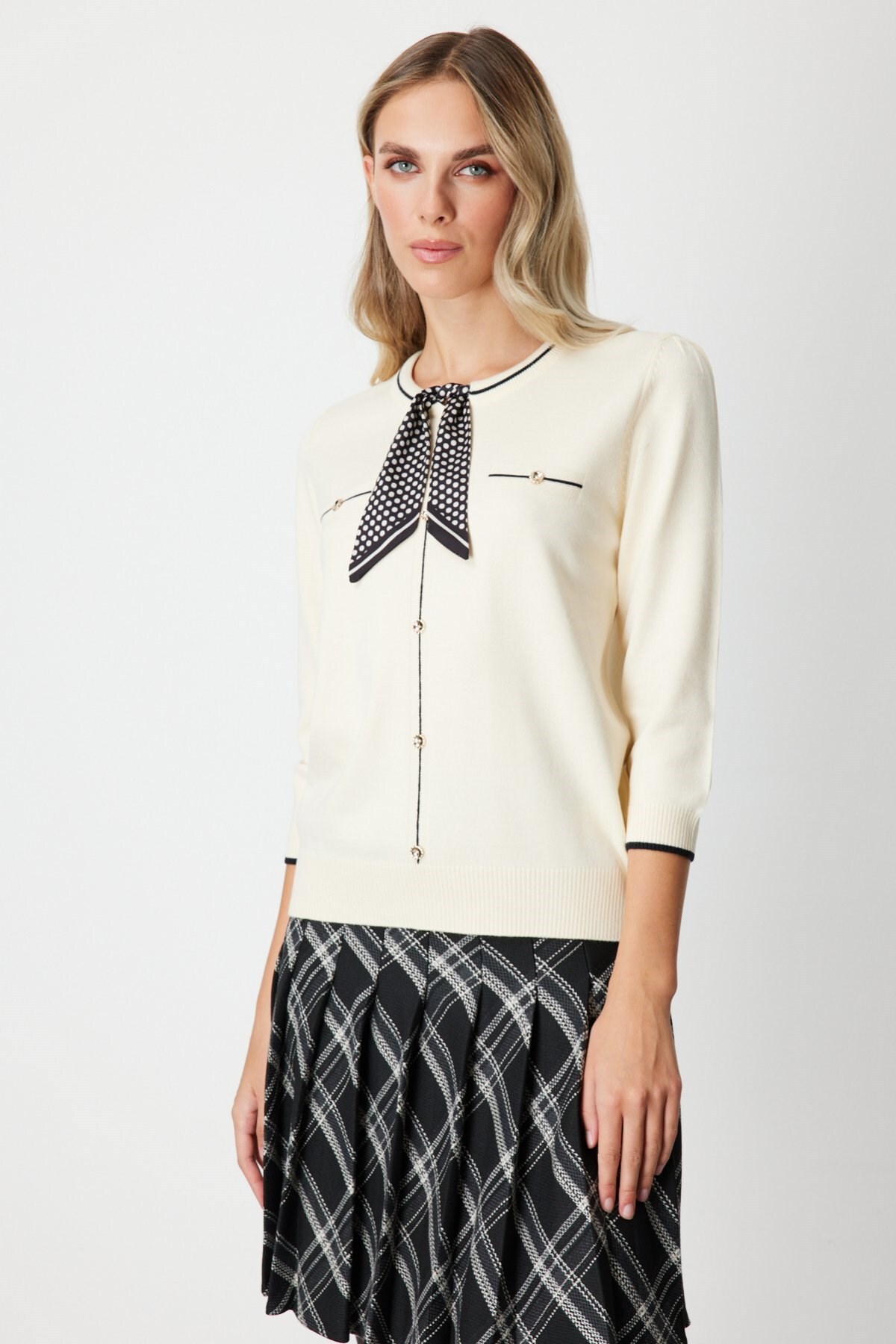 Yakası Fularlı Triko Kazak Krem 65352
