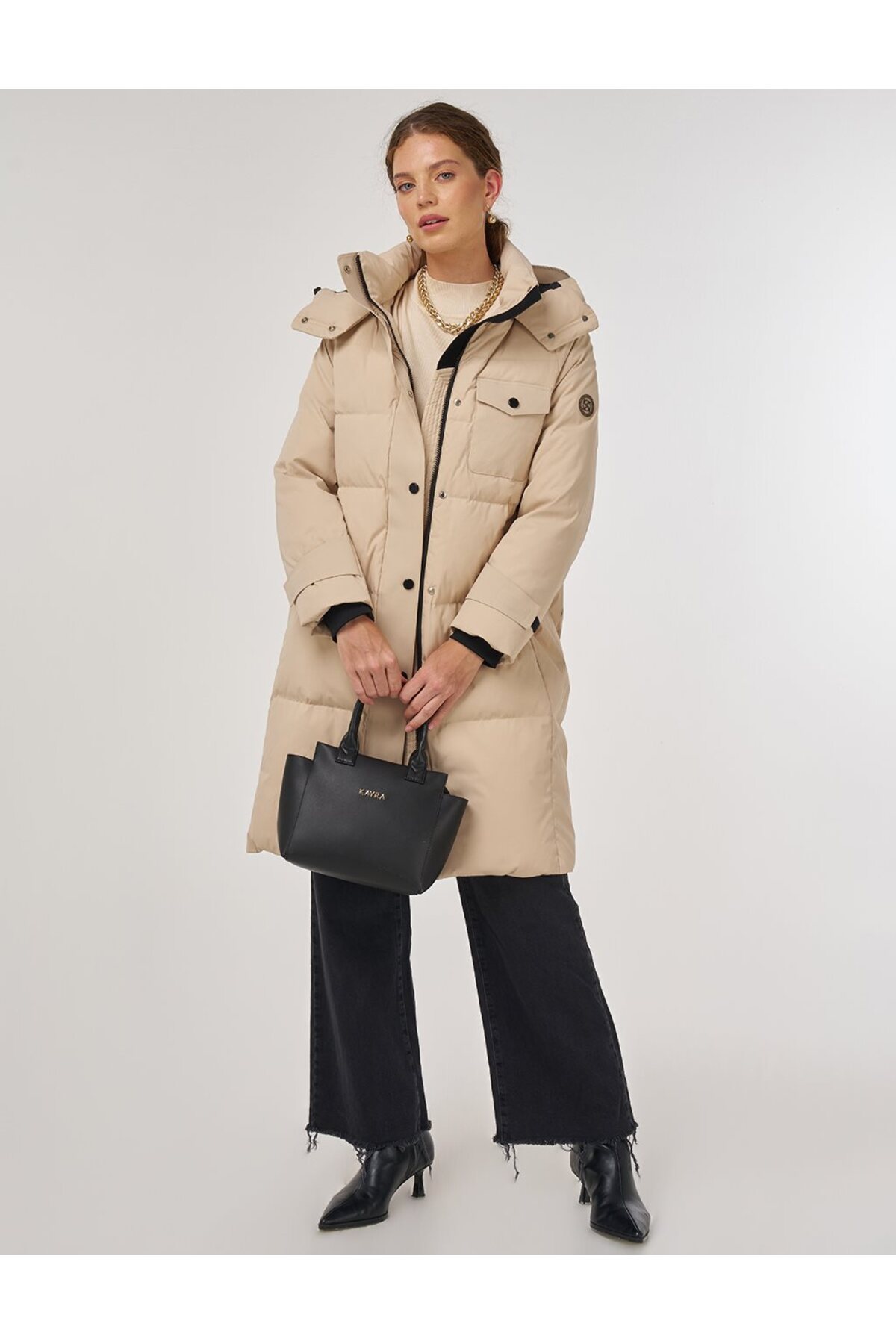 Cep Detaylı Kaz Tüyü Mont Krem